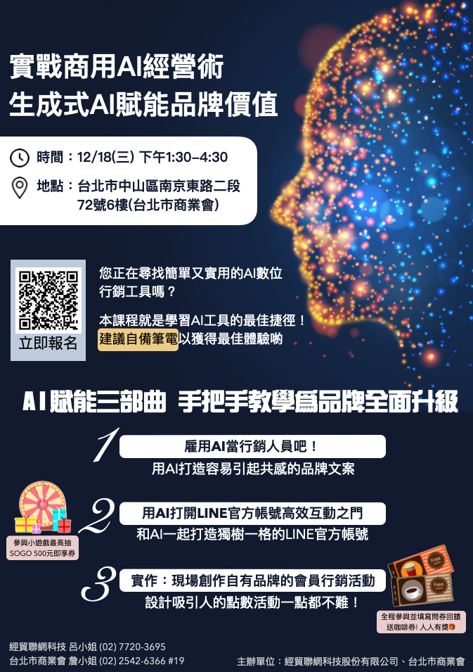 主題:實戰商用AI經營術 生成式AI賦能品牌價值 主講人:經貿聯網科技股份有限公司 數位創新團隊 時間:12月18日(三) PM 1:30 ~ 4:30 地點:台北市南京東路二段72號6樓(台北市商業會) 【捷運:松江南京站1號出口(往吉林路口),走路約3分鐘 / 公車:南京吉林路口下車】 費用:免費(Free) (報名後若無法出席參加,敬請來電告知,避免佔用名額,不便之處敬請原諒!) 報名方式 :請填寫GOOGLE表單報名,名額有限(60位) GOOGLE報名連結:報名 市商會教育訓練