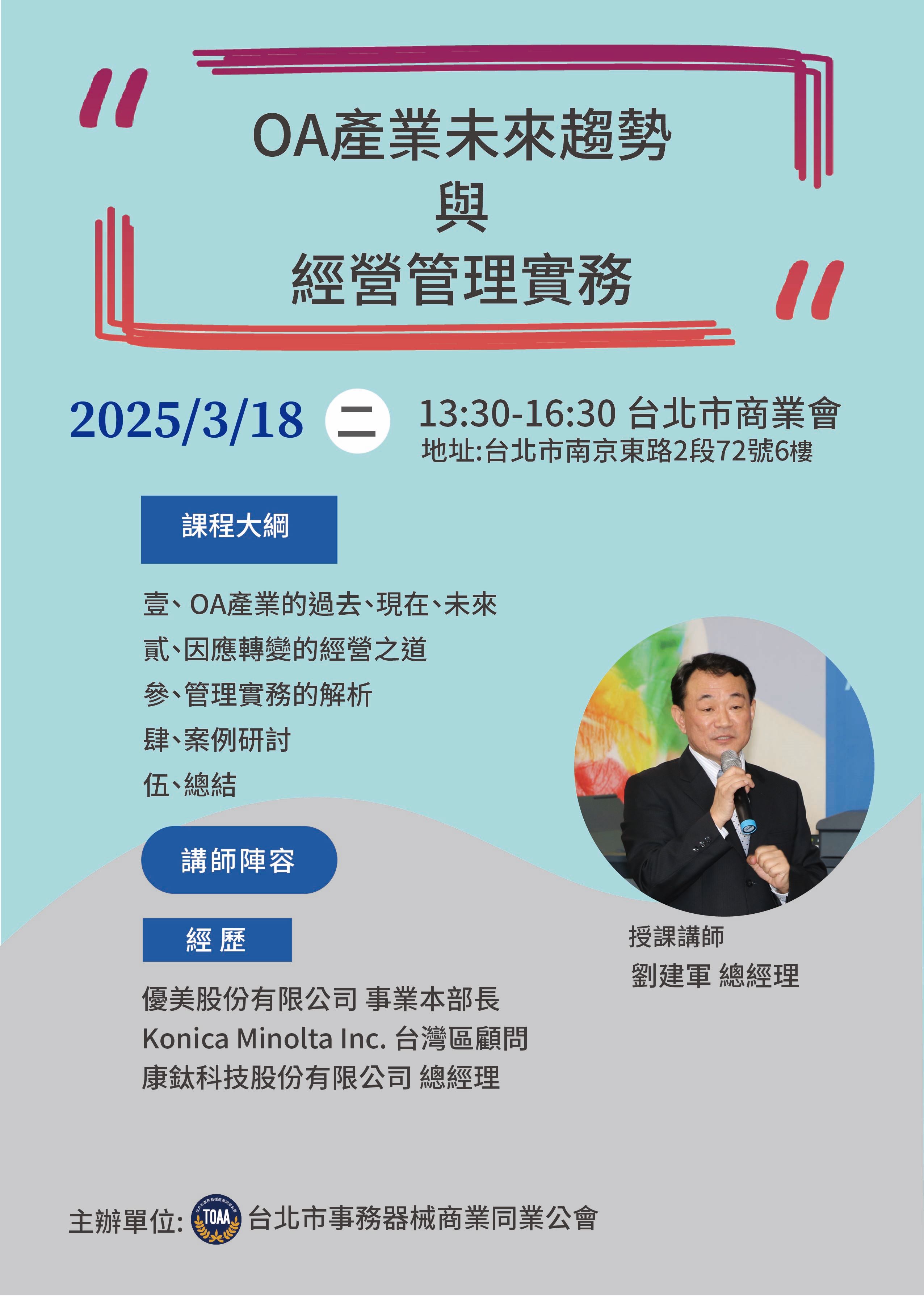 時間:114年3月18日(星期二) PM 1:30 ~ 16:30 上課地點:台北市南京東路2段72號6樓(台北市商業會會館) 費 用:免費(台北市事務器械商業同業公會補助) 報名方式:採網絡報名。名額有限(六十位),請儘早報名(額滿為止) 報名後若無法出席參加,敬請來電告知避免佔用名額,不便之處敬請原諒! 洽詢電話:27415418 聯絡人: 鄭小姐、李小姐 傳 真:27769720 主辦單位:台北市事務器械商業同業公會 報名網址:報名網址連結