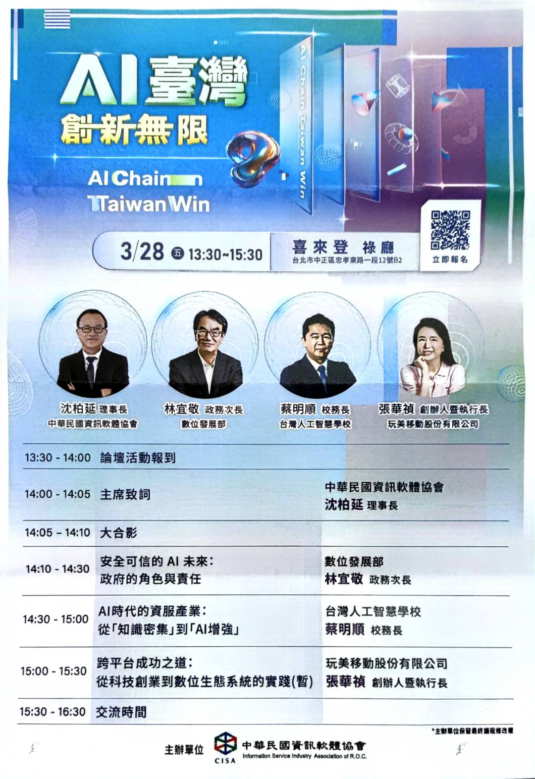 為因應這一系列持續不斷的AI變革,主辦單位中華民國資訊軟體協會特邀請產官學界代表,共同探討AI發展趨勢與潛力,分享成功應用案例。歡迎資服業者免費報名參加本論壇!!